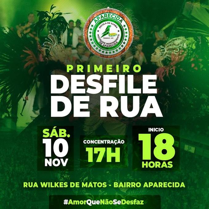 Manaus/AM - Neste sábado (10/11), o Grêmio Recreativo Escola de Samba (Gres) Mocidade Independente de Aparecida realiza o seu primeiro Desfile de Rua. A agremiação levará todos os seus principais setores: passistas, comissão de frente, baianas, corte da escola, com rainha, madrinha e musa de bateria, a rainha da escola, casais de mestre-sala e porta-bandeira, intérpretes e músicos, e é claro, a bateria show da Aparecida, “Universidade do Ritmo”.