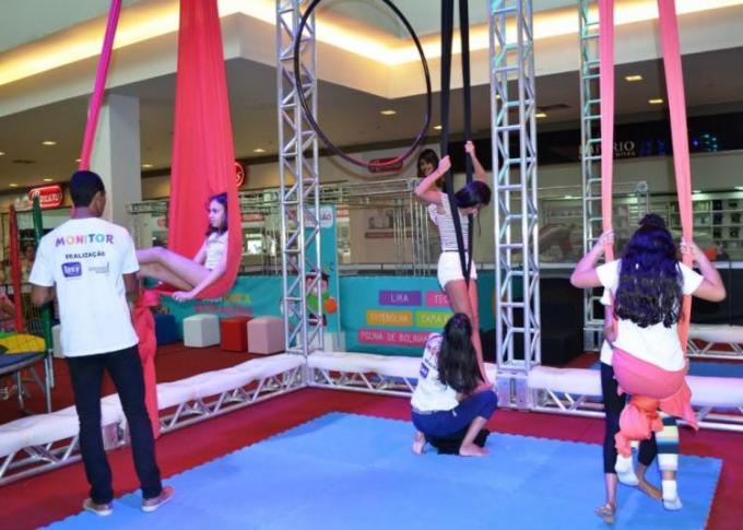 No Espaço Circo todo mundo pode brincar, independente  da faixa etária. O público se diverte num só ambiente com três atrações: atividades com tecidos, lira e trapézio, escalada e piscina de bolinhas. Todos com monitores para orientação dos participantes.