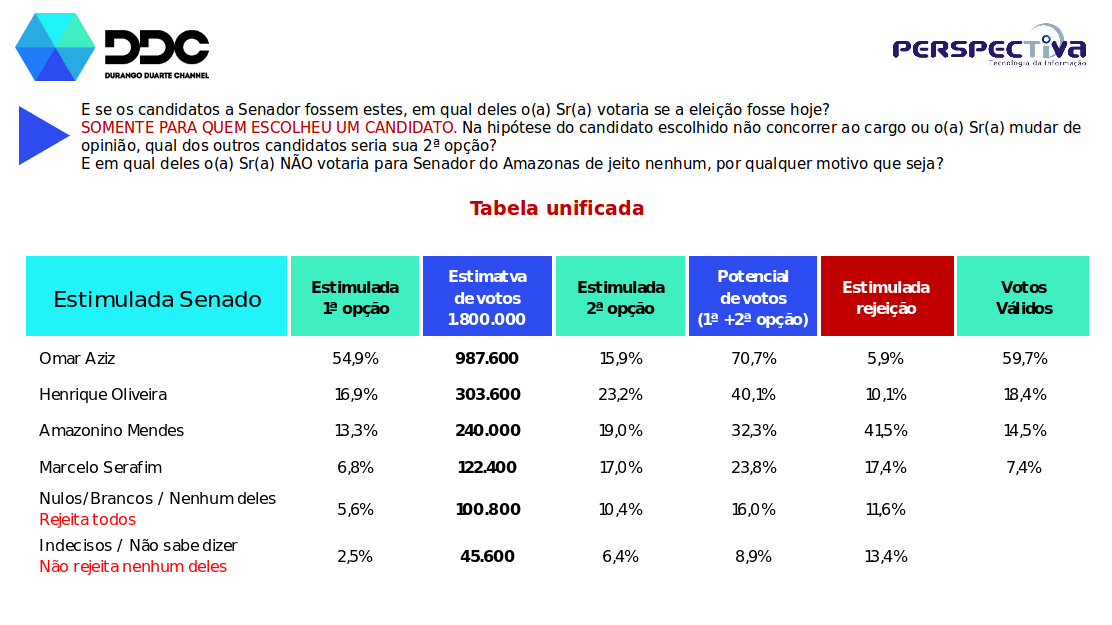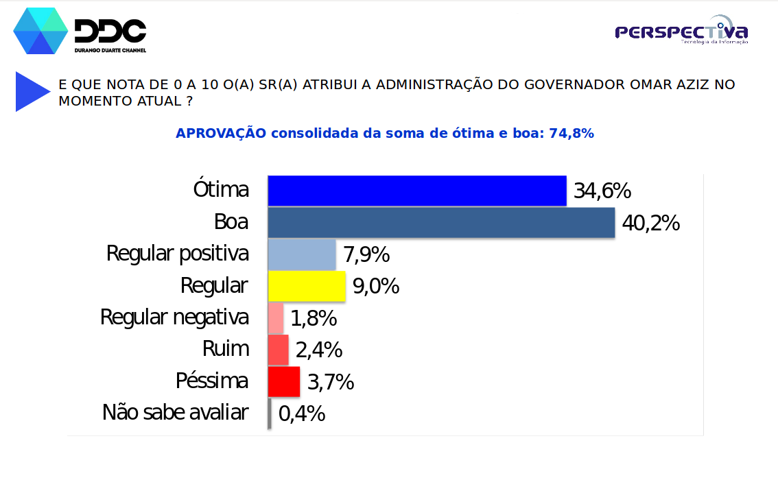 O governo Omar Aziz tem a aprovação de mais de 74% dos amazonenses, revela pesquisa da Pesrpectiva, divulgada nesta sexta-feira, data em que Omar deixa o governo para se candidatar a uma vaga ao Senado. A pesquisa também aponta quem está na frente para o Governo do Estado, o Senado e os candidatos favoritos para a Câmara Federal. A Perspectiva ouviu 1.500 eleitores, sendo 825 em Manaus e 675 em 10 municipios do Amazonas. A pesquisa, realizada entre os dias 25.03 A 03.04 está registrada no TRE/Am sob o número n. 00001/2014 e TSE/BR sob o número 000060/2014