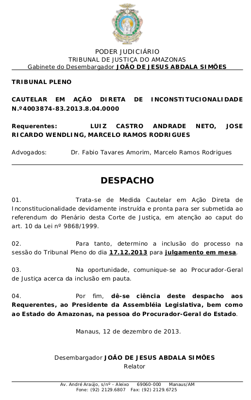 Os autos da ADIN foram parar nas mãos de João Simões depois que no dia 12 mês passado, o desembargador Jorge Lins, plantonista do Tribunal de Justiça do Amazonas, concedeu liminar aos deputados Marcelo Ramos, Luiz Castro e José Ricardo, que ingressaram com a medida.