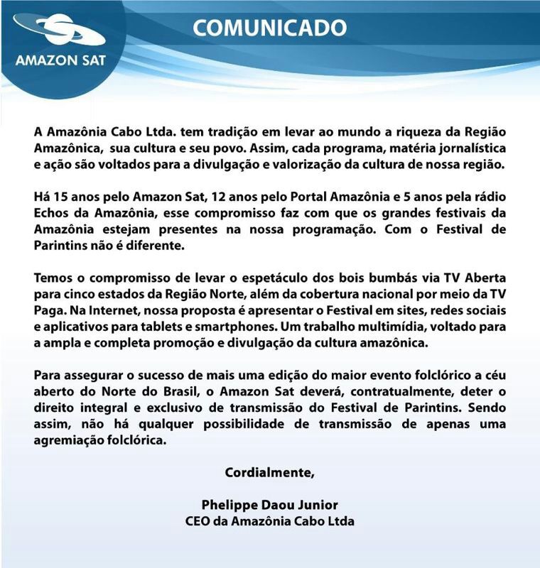 o Amazonsat desistiu de transmitir o festival folclórico de Parintins e deixou o boi Caprichoso numa situação complicada. Agora será obrigado a negociar com a TV aCritica, que fica praticamente com a exclusividade na transmissão do evento. Em Nota, o diretor do Amazonsat e Rede Amazônica, Phelippe Daou Júnior, explica a desistência. Veja abaixo.