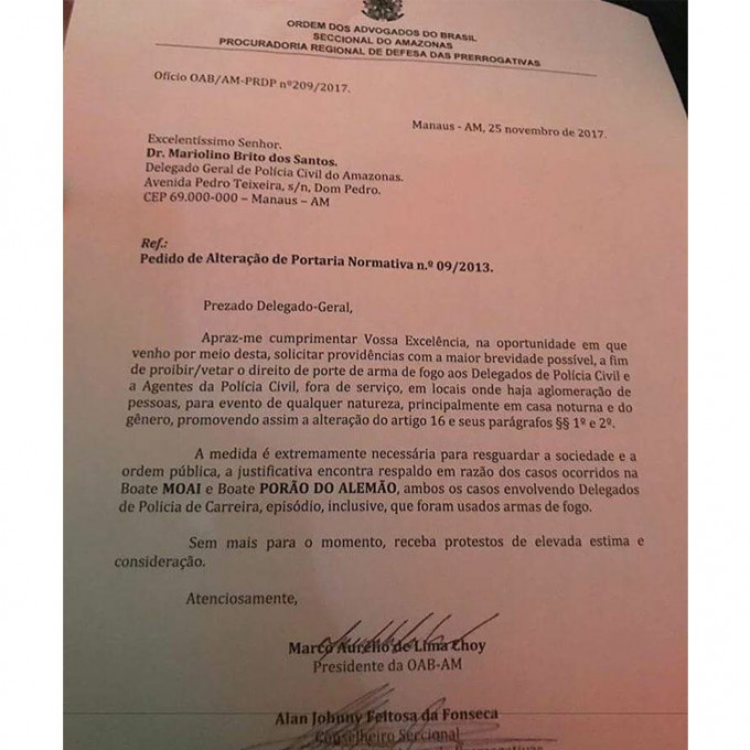 Manaus/AM - A Ordem dos Advogados do Brasil Seccional Amazonas (OAB-AM) encaminhou um ofício ao delegado geral da Polícia Civil Marcolino Brito solicitando a revogação da portaria que autoriza policiais civis a entrarem armados em estabelecimentos de entretenimento. O documento foi enviado no último sábado(25) após o advogado Wilson Justo ser assassinado pelo delegado Gustavo Sotero, no Porão do Alemão.