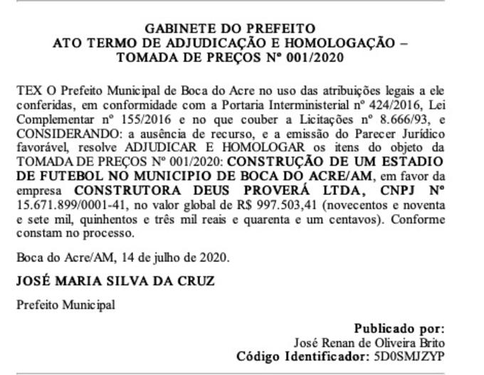 Manaus/AM - O prefeito de Boca do Acre/AM, José Maria Silva da Cruz - o Zeca Cruz - homologou no último dia 14 de julho, a favor da Construtora Deus Proverá Ltda, a construção de um estádio naquele município.