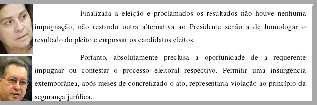 O relator em seu voto ser absolutamente preclusa a oportunidade de Graça Figueiredo impugnar ou contestar o processo eleitoral respectivo. “Permitir uma insurgência extemporânea, após meses de concretizado o ato, representaria violação ao princípio da segurança jurídica”.