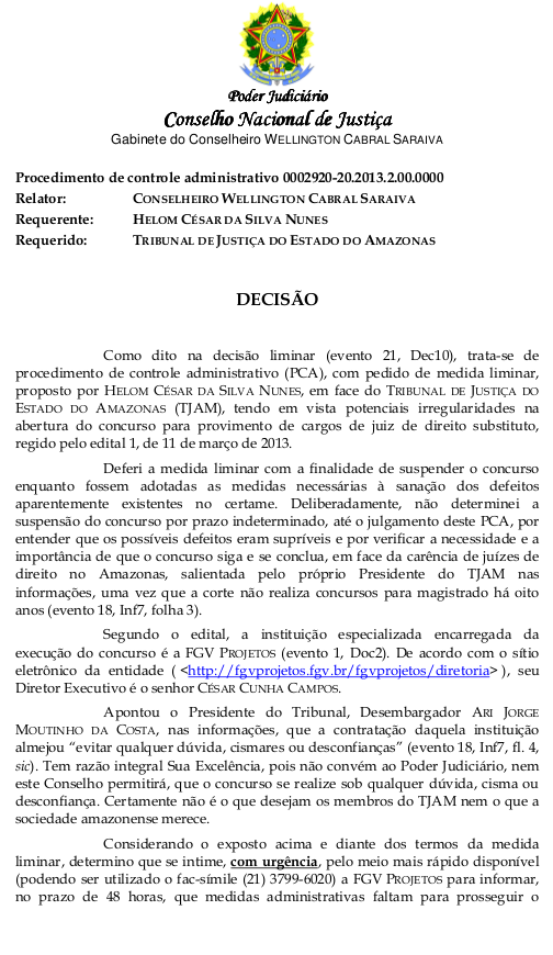A decisão do conselheiro Wellington Cabral Saraiva, do Conselho Nacional de Justiça, que suspendeu a realização das provas do concurso público do Tribunal de Justiça do Amazonas para os cargos de juiz de direito substituto, que seriam realizadas na última quarta-feira, dia 5, até que fosse divulgada a composição da comissão do concurso e da banca examinadora, continua valendo.