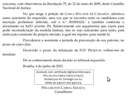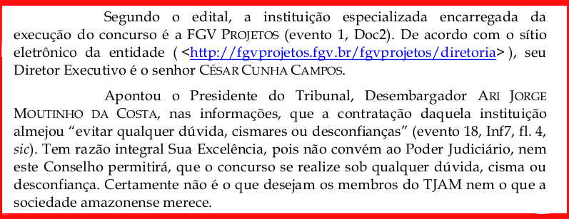 O conselheiro relator determinou que o diretor executivo da Fundação Getúlio Vargas, César Cunha Campos, responsável pelo certame, seja intimado o mais rápido possível para informar, no prazo de 48 horas, que medidas administrativas faltam para prosseguir o concurso, com observância da Resolução 75, de 12 de maio de 2009, do Conselho Nacional de Justiça.