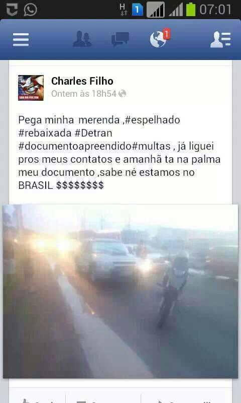 No início da noite desta quarta (15), o Consultor Charles Filho, 21, postou em seu Facebook que havia sido surpreendido pela fiscalização de trânsito por usar carro rebaixado e com vidros espelhados. Seria um mero comentário de um jovem que resolveu testar as leis de trânsito se não fosse a afirmação grave que faz: "...já liguei pros meus contatos e amanhã ta na palma (da mão) meu documento, sabe né estamos no BRASIL $$$$$$". Veja: