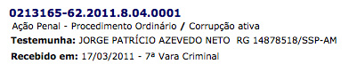 Ao contrário do que foi mencionado no parágrafo acima, Jorge era testemunha no processo n°: 0213165-62.2011.8.04.0001, e não réu.