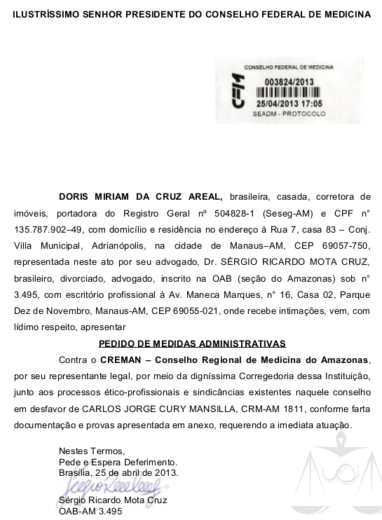 Depois de ver vasta documentação que lhe foi apresentada, Vinagre pediu para ser formalizada entrega no protoloco do CFM, e disse que Carlos Cury já é passivo de uma intervenção cautelar, em virtude da grande quantidade de sindicâncias abertas, com indícios consistentes da materialidade de atos danosos contra mulheres em Manaus.