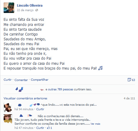 Em uma de suas últimas postagens, Lincoln fez referência a uma canção de Thalles Roberto, chamada 'Casa do Pai':