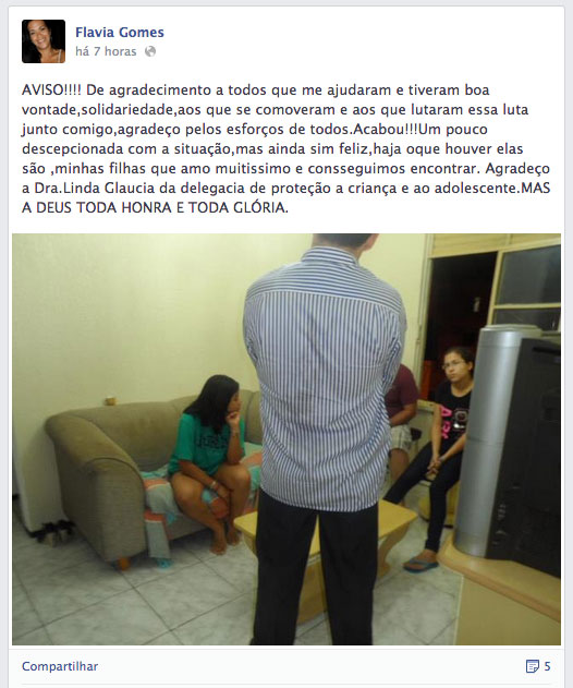 As irmãs Fernanda Costa, 21, e Lisandra Gomes, 15 ficaram 48 horas sem dar notícias, com exceção de uma mensagem: "Mãe, não se preocupe. Estamos longe, mas estamos bem" . Ao que parece ter sido uma brincadeira de mau gosto feita com Flávia.