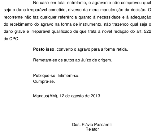 O desembargador Flávio Humberto Pascarelli, em decisão monocrática, disse que como a defesa não conseguiu apontar qual o dano irreparável alegado, converteu o agravo de instrumento em agravo retido, determinando que os autos sejam devolvidos ao juízo de origem.