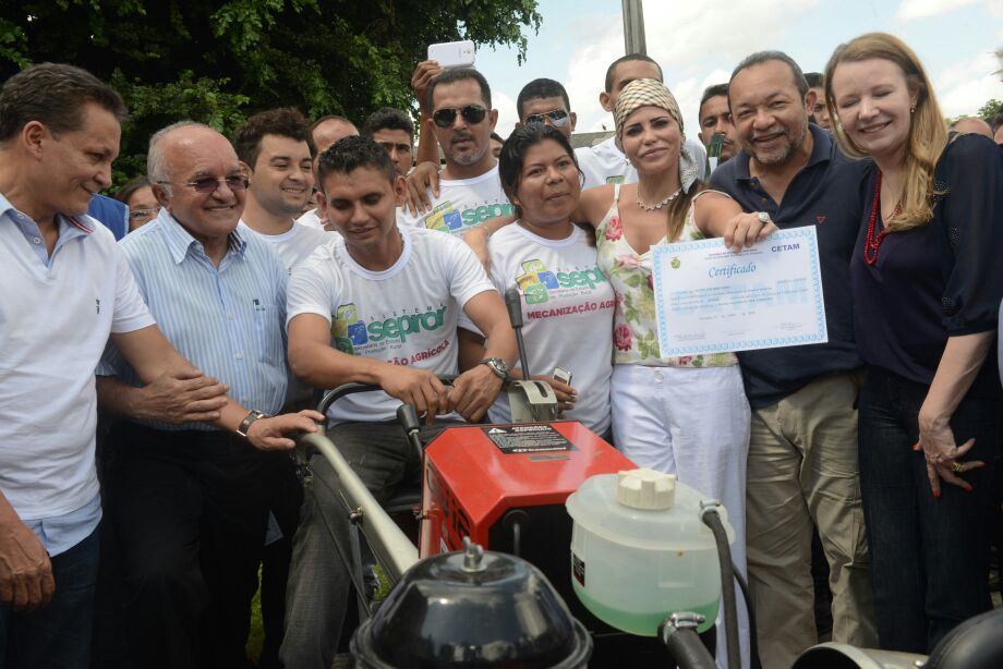 O governador do Amazonas em exercício, José Melo, participou da entrega simbólica, no Parque de Exposições Agropecuárias Eurípedes Lins, de implementos agrícolas, que serão destinados a produtores de 11 municípios das calhas do Alto Solimões, Madeira e Região Metropolitana de Manaus. No evento, estavam presentes a presidente do Fundo de Promoção Social, a primeira-dama do Estado, Nejmi Aziz, o secretário de Estado de Produção Rural, Eron Bezerra, a senadora Vanessa Grazziotin, autora da emenda parlamentar que financiou os equipamentos, além de prefeitos do interior, secretários de Estado e municipais e deputados estaduais. Foram entregues microtratores, distribuidores, carretas agrícolas tipo madeira, encanteradores, enxada rotativa, sucadeiras e roçadeiras agrícolas, para 21 produtores.
