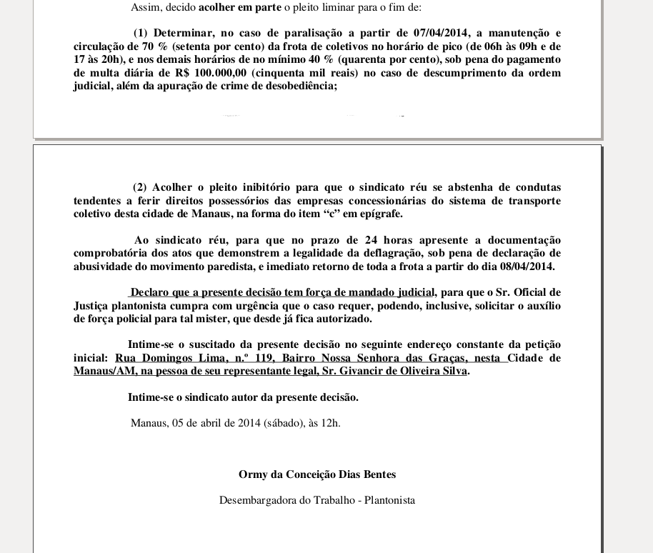 A desembargadora plantonista do Trabalho da 11º Região, Ormy da Conceição Dias Bentes, afirmou, em despacho, que o Sindicato dos Rodoviários deve manter 70% dos trabalhadores em atividade durante os horários de pico, pela manhã, de 6h às 9h, e a tarde no intervalo de 17h às 20h.