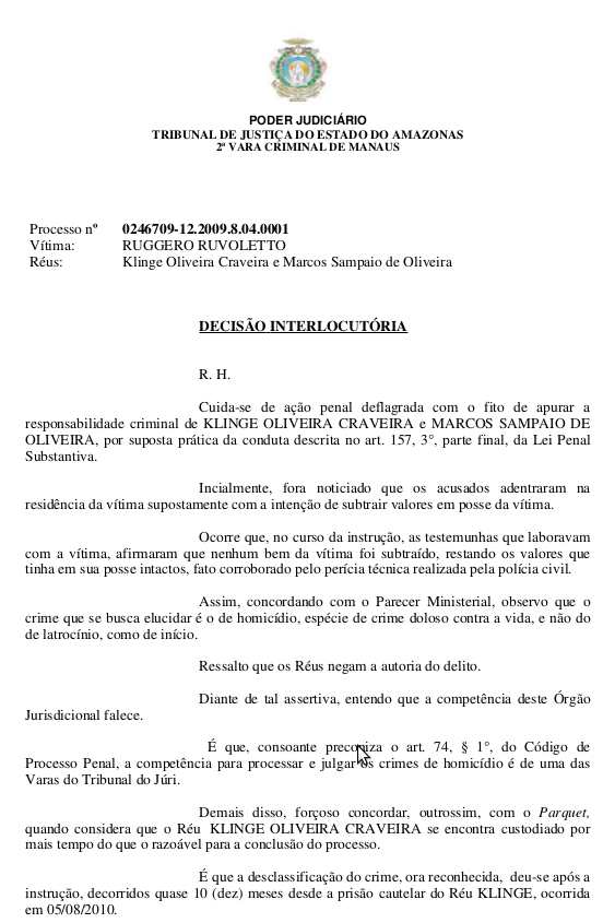 Preso pelo assassinato do padre italiano Ruggero Ruvoletto, Klinger Oliveira Craveira está fora do presidio desde de maio de 2011, quando foi beneficiado com alvará de soltura expedido pelo juiz Jaime Artur Santoro Loureiro.