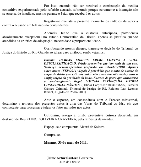 A polícia conseguir em julho de 2010, dez meses depois do crime, prender Klinger Oliveira no município de Itacoatiara (a 176 quilômetros a leste de Manaus).