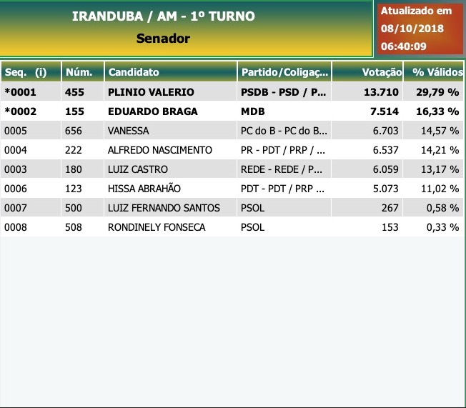Início Amazonas Iranduba: Senador - Candidatos mais votados