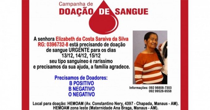 Elizabeth da Costa Saraiva,59, está precisando urgentemente de doação de sangue nos próximos dias, ela está internada na Unidade de Tratamento Intensivo do Hospital Santa Júlia. A filha, Edilza Aguiar, pede ajuda aos leitores do Portal do Holanda para conseguir as doações.