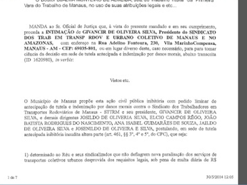 A liminar foi concedida pelo juiz da Primeira Vara de Trabalho de Manaus, da Delegacia Regional do Trabalho, 11ª Região, Djalma Monteiro de Almeida, ao mandado de diligência com pedido de tutela antecipada e indenização por danos morais, contra o Sindicato dos Trabalhadores em Transportes Rodoviários e Urbano Coletivo em Manaus e no Amazonas, impedindo-o de realização de greve no sistema de Transporte Coletivo, em Manaus, sob pena de multa diária de R$ 100 mil.