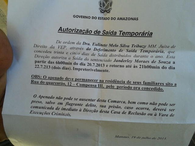 O preso do semi-aberto do Complexo Penitenciário Anísio Jobim (Compaj), Janderley Morais de Souza, o "Doutorzinho", 23, autorizado pela juíza Eulinete Melo Silva Tribuzy, da Vara de Execuções Penais, a uma saída temporária, foi preso em flagrante por policiais da Ronda Ostensiva Cândido Mariano na tarde do último domingo com uma pistola PT 40 (arma de uso exclusivo das policias).