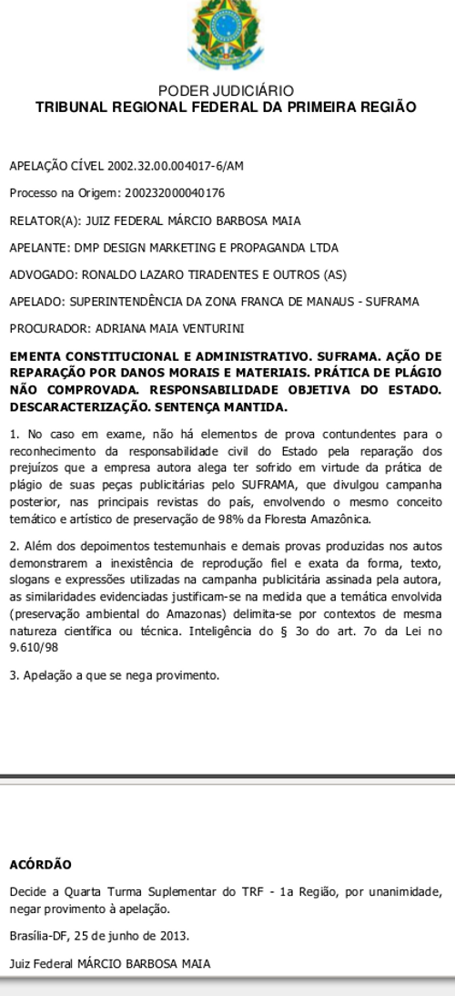 A DMP Design Marketing e Propaganda Ltda, não conseguiu reverter em Brasília a decisão da improcedência de uma ação de indenização por dano moral movida contra a Superintendência da Zona Franca de Manaus (Suframa). Os desembargadores do Tribunal Regional Federal da 1ª Região, em unanimidade, negaram provimento a apelação da empresa, mantendo a sentença de primeiro grau.
