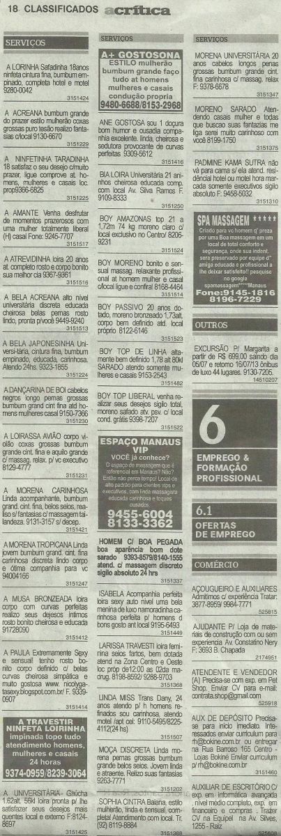 Um dos anúncios publicados em aCritica deste domingo é da "Lorinha Safadinha, 18 anos, ninfeta cintura fina, bumbum empinado, completa". O outro da "Acreana Bumbum Grande, estilo mulherão, coxas grossas puro tesão". Em todos os anúncios é dito que as mulheres ( a maioria se diz universitária) realizam todas as fantasias masculinas ou femininas.