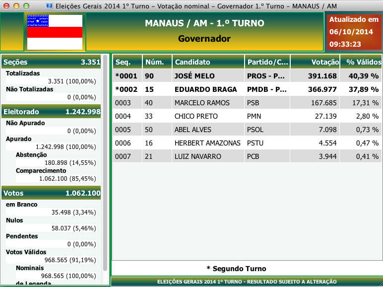 O candiato José Melo ganhou em vários municípios, mas em Manaus ele colocou 24.191 votos a mais sobre o adversário Eduardo Braga (PMDB). Marcelo Ramos obteve cerca de 170 mil votos na capital.