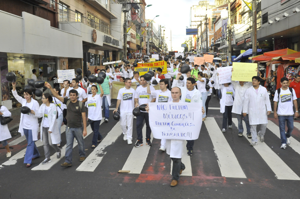 Acompanhados pela Polícia Militar, os manifestantes protestaram contra a validação do diploma de médicos estrangeiros e, sobretudo, contra o que chamam de"sucateamento da saúde no Amazonas".