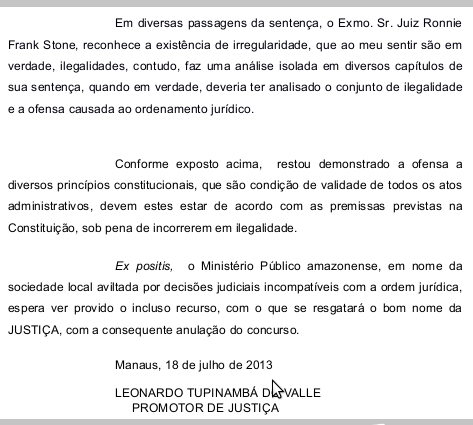 Na apelação, o promotor Leonardo Tupinambá aponta irregularidades no concurso e diz que a mais grave “foi a ausência de divulgação das notas nas relações de aprovados. As listas limitavam-se a indicar o nome dos aprovado", enquanto as notas eram mantidas em sigilo, o que inviabilizava,segundo ele, "o controle administrativo”.