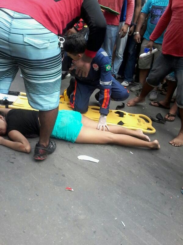 MANAUS/AM - Duas moças em uma moto modelo Biz (placa NOK 3901), foram atropeladas no cruzamento entre as ruas São Luiz com São Benedito, na Colônia Santo Antônio.