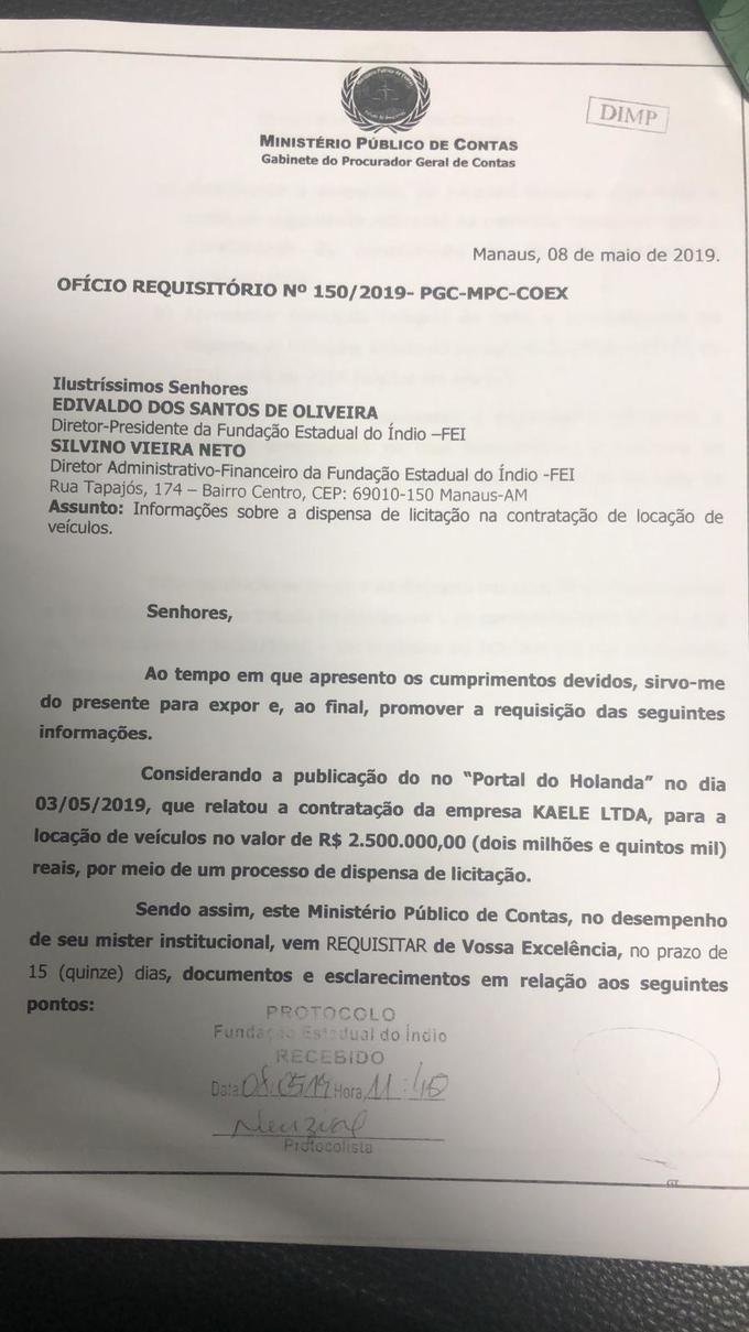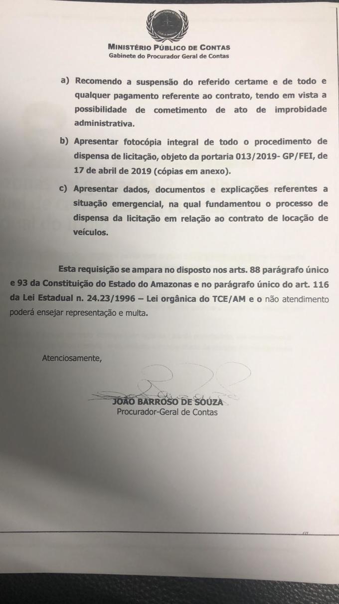 Manaus/AM - O procurador-geral de contas do Ministério Público de Contas do Amazonas (MPC-AM), João Barroso, recomendou ao diretor-presidente da Fundação Estadual do Índio (FEI), Edivaldo de Oliveira, que suspenda o contrato de R$ 2,5 milhões para locação de veículos. A medida ocorre após denúncia publicada na Coluna Bastidores, do Portal do Holanda, no último dia 3 deste mês. A medida foi tomada diante de fortes indícios de irregularidades.