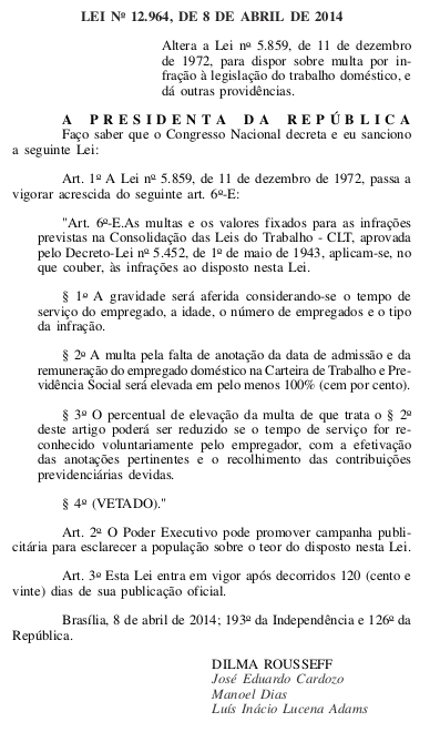 Não tá para brincadeira não. Quem tiver empregada doméstica terá. obrigatoriamemte, que assinar a sua carteira. É quem não o fizer será penalizado na forma de lei aprovada pelo Congresso Nacional e sancionada pela Dilma Rousseff. Confira, na íntegra, a nova lei.