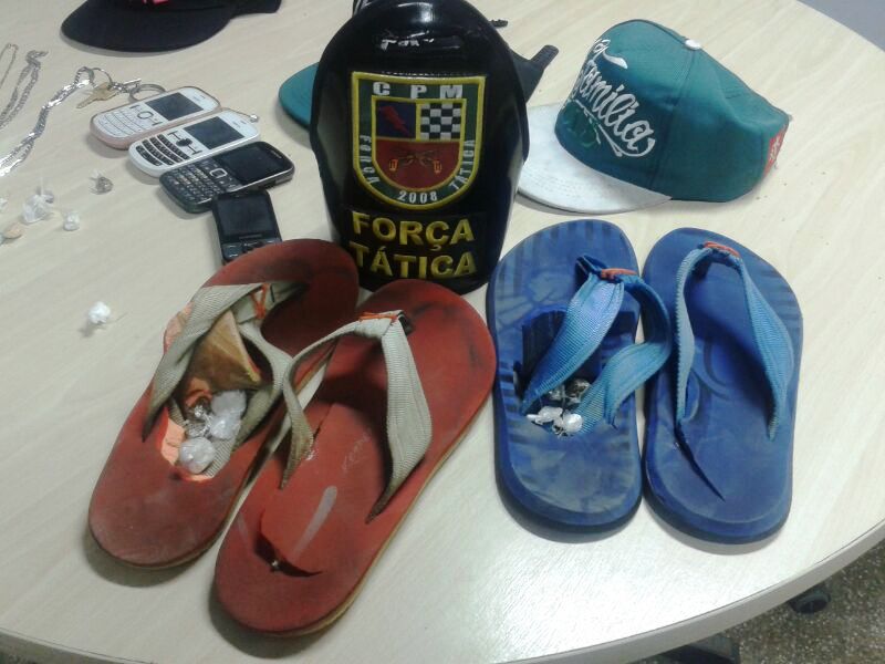 Três menores e um adulto utilizavam de um pequeno truque para vender drogas sem ser importunados pela Policia. Escondiam os papelotes dentro das sandálias, artesanalmente abertas, com espaço para abrigar, cada par, cerca de 10 papelotes. O truque acabou descoberto quando a polícia recebeu uma denúncia anônima. O maior de idade é Elielton Nascimento Oliveira, de 19 anos.