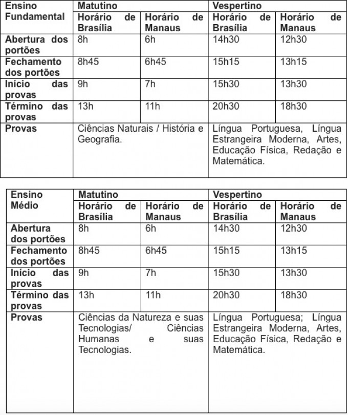 Horário das provas – Em Manaus, para quem se inscreveu para fazer as provas no turno matutino, os portões vão abrir às 6h (8h de Brasília) e fecharão às 6h45, com início das provas às 7h para os ensinos Fundamental e Médio. Quem escolheu o período da tarde, os portões abrem as 12h30 (14h30 de Brasília) e fecham as 13h15, com início às 13h30, também para os ensinos Fundamental e Médio.