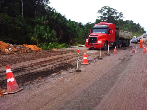 Ainda há restrição porque só foi liberada uma faixa da rodovia que está servindo para o trânsito nos dois sentidos, mesmo assim o Dnit assegura que não há retenção, no momento, na área do quilômetro 58, onde o órgão ainda está trabalhando.
