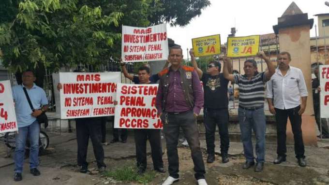 Os agentes penitenciários também aderiram à paralisação nacional. Eles estão concentrados em frente a penitenciária Raimundo Vidal Pessoa, Centro. Segundo o presidente do Sindicato dos Servidores Penitenciários do Amazonas, Rocinaldo Silva, funcionando hoje apenas 30% da categoria nos presídios.