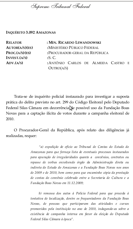 O ministro Ricardo Lewandowski, do Supremo Tribunal Federal, relator de inquérito policial contra o deputado federal Silas Câmara, deferiu o pedido do Procurador Geral da República, Roberto Gurgel, para que a Polícia Federal realize diligências na Fundação Boas Novas na tentiva de localizar pessoas que participaram de cursos promovidos pela instituição em 2010.