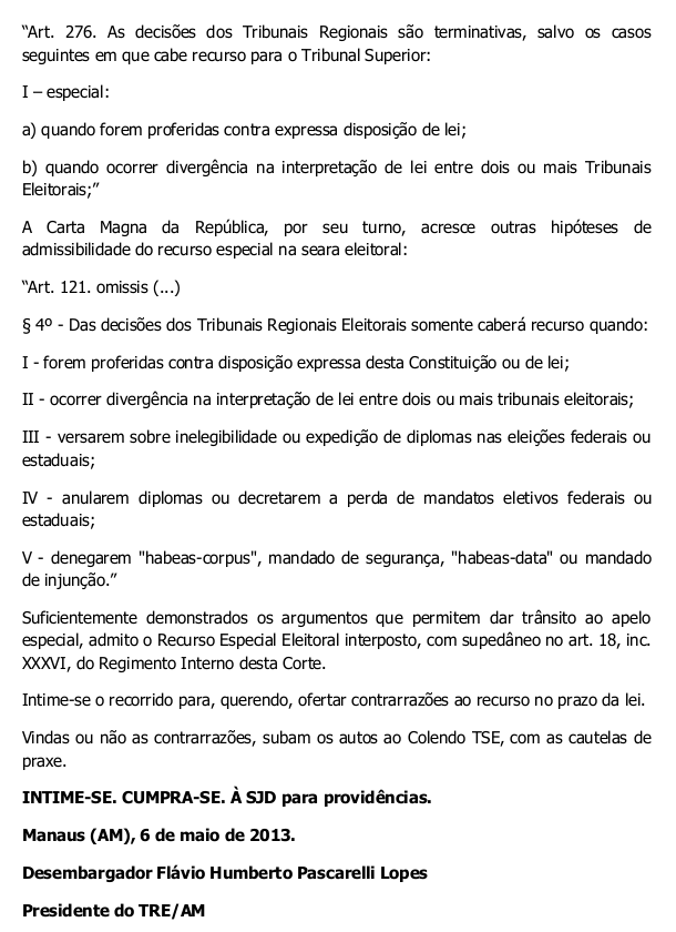 O recurso especial foi admitido no último dia 6 pelo presidente do TRE-Am, desembargador Flávio Humberto Pascarelli. Os autors já foram enviados TSE, em Brasília, onde os ministros decidirão o futuro de Tabosa e Glória Carrate.