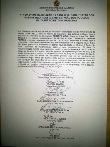 Veja a íntegra da ata acertada entre o governo estadual e os praças da PM.