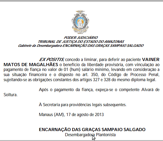 O acusado já havia coseguido um habeas corpus anteriormente, concedido pela juíza Eulinete Melo Silva Tribuzy, da 11ª Vara Criminal, que recuou depois de pressão do presidente do Tribunal e Justiça do Amazonas, Ary Moutinho.