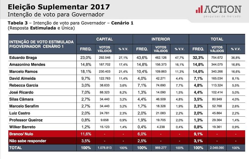 O eleitorado começa a reagir ao nome do senador Eduardo Braga como eventual candidato ao governo. É o que revela sondagem da 365, que identificou uma queda de mais de 6 pontos do senador em Manaus. Até 24 de maio, quando outro instituto, Action, realizou pesquisa na cidade e alguns municípios do Amazonas, o cenário era outro, francamente favorável a Braga. Essa mudança em poucos dias - a pesquisa da 365 é de 31 de maio - indica que já há impacto das denúncias contra o senador, feitas no âmbito da Lava Jato. Este é um quadro que tende a se agravar, com implicações diretas nas eleições para o mandato tampão no Amazonas.