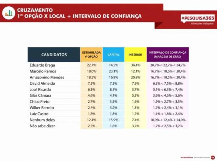 O cenário, desenhado na pesquisa da 365, não mostra o eleitorado disposto a fazer apostas no novo - candidatos pouco experientes com o processo administrativo de um governo. O que explica o crescimento do ex-governador Amazonino Mendes, que praticamente cola em Marcelo Ramos e ameaça encostar em Eduardo Braga.