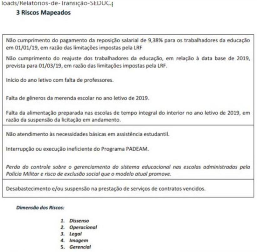 No documento da equipe de transição é apontada a “perda de controle e gerenciamento do sistema educacional nas escolas administradas pela Policia Militar e risco de exclusão que o modelo promove”. Na prática, a equipe de Wilson Lima pretende “limar”as escolas militares. No núcleo do governo a intenção é fechar todas elas.