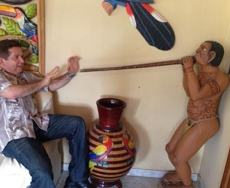 Quem está "assustado" é o deputado Wanderley Dallas: de Tabatinga, ele postou foto onde aparece em pose de defesa sob ameaça de ser alvejado por dardo disparado por um índio mulungú. Mas é só pose mesmo. O índio é uma escultura. Mas a foto revela o lado menino de Dallas...