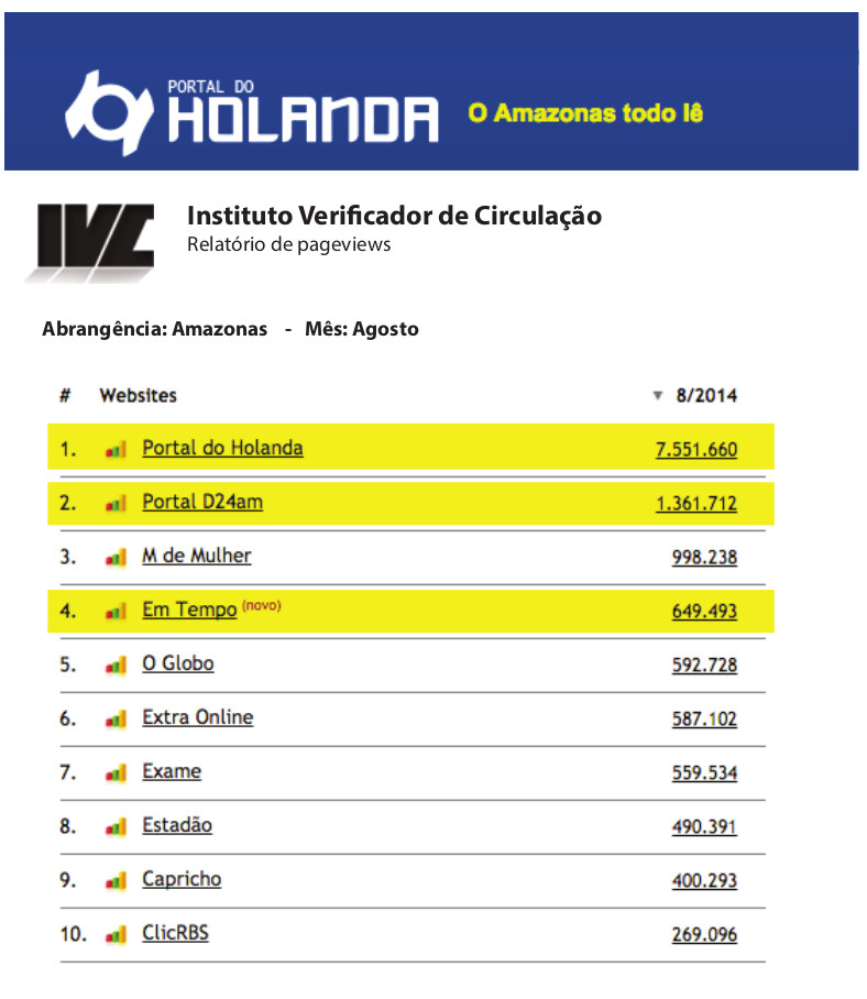 O número de páginas visitadas pelos leitores do Portal do Holanda em agosto é 3,5 vezes o resultado da soma do índice alcançado pelos sites D24am, do jornal Diário do Amazonas , e o EmTempo.com (do jornal Amazonas em Tempo). Os dados foram extraídos da auditoria realizada pela Instituto de Verificação de Circulação (IVC) em 65 sites nacionais filiados. O Portal do Holand a contabilizou sozinho 9,3 milhões de páginas abertas pelos leitores , enquanto o Em Tempo, que aparece pela primeira vez no ranking do IVC, e D24am juntos chegaram a apenas 2,5 milhões. O número de usuários únicos (unique browsers) coloca o Portal do Holanda bem na frente com 834.167 leitores, contra 466.327 do Em Tempo e 458.475 do D24am. Isoladamente, tem o dobro de cada um deles. Na região Norte o Portal do Holanda está na frente de todos os sites nacionais auditados pelo IVC. .Veja no final da coluna o ranking geral dos sites auditados no País.
