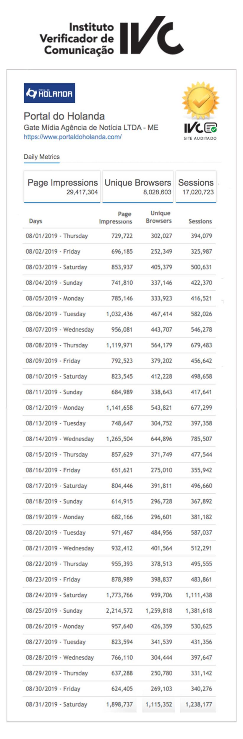 Foram 29 milhões de páginas visualizadas pelo Portal do Holanda em agosto, por 8 milhões de usuários. Os dados são do IVC. Confira abaixo: