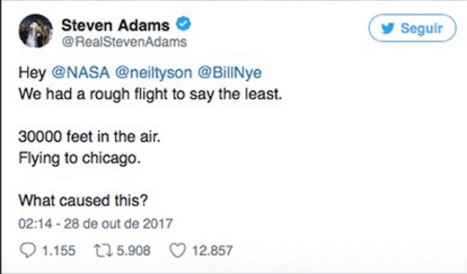 O jogador, Steven Adams, em seguida fez um twitte a NASA. “Oi, NASA. Tivemos um voo difícil para dizer o mínimo. 30.000 pés no ar. Voando para Chicago. O que causou isso?, um ovni?” questionou.