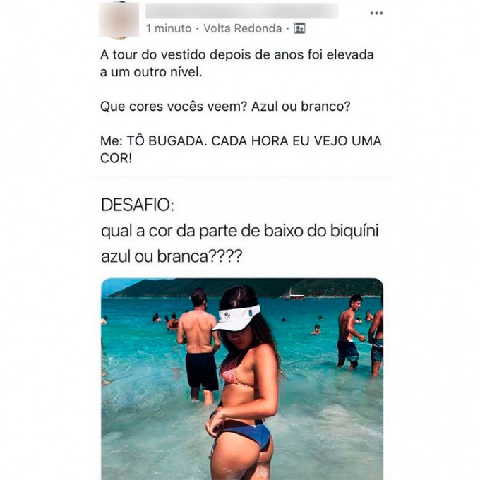 Alguns internautas identificaram azul, outros veem como branco. A cor só fica clara quando você presta bastante atenção. Para esclarecer qual é a cor real da peça, a dona da imagem postou uma outra imagem revelando que o biquíni realmente é branco.