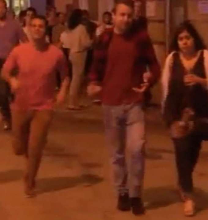 Enquanto outras pessoas corriam desesperadas ele caminhava, ao lado de uma mulher com quem estava de braços dados, sem  demonstrar grande preocupação.