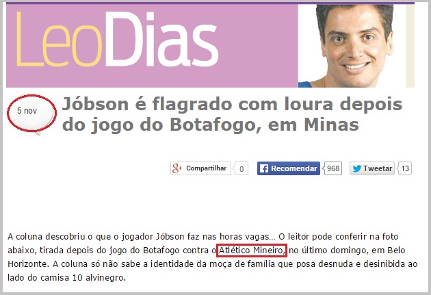Segundo o Léo Dias, o jogador Jobson enfrentou os dois maiores times mineiros no mesmo dia, pintou e mudou o corte de cabelo e ainda teve tempo de tirar foto com uma loira pelada??? Concluímos que esse cara só pode ter superpoderes. Poderíamos ter concluído também que a foto não é do mesmo dia e o jornalista fofoqueiro errou em TUDO na informação, mas qual seria a graça?